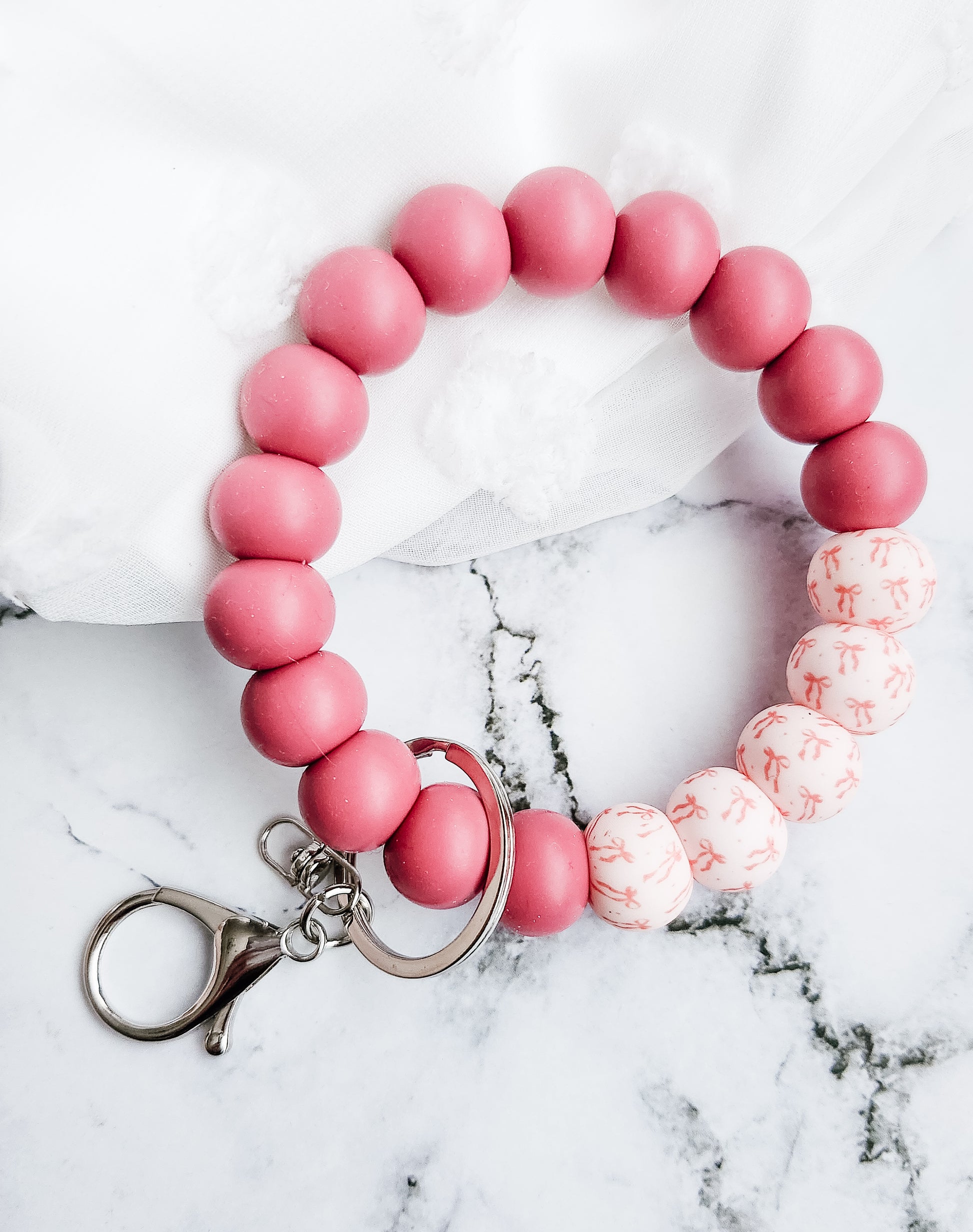 Designed to make everyday moments feel a little more special, this key wristlet is handcrafted with care and finished with delicate pink bow printed beads. It is paired with solid beads matching perfectly.